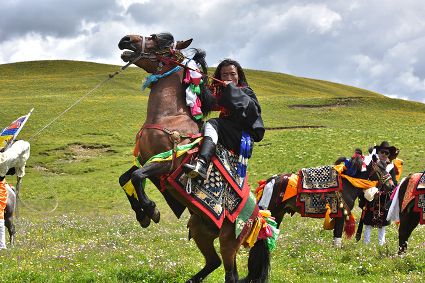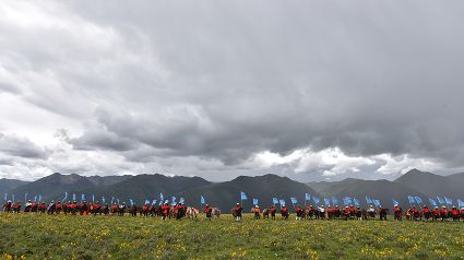 花海上、馬匹間,康巴漢子摩拳擦掌;藍(lán)天下、溪流旁,盛裝觀眾搖旗吶喊。19日,作為運(yùn)動(dòng)會(huì)的分項(xiàng)活動(dòng)之一,德差鄉(xiāng)羊格貢草原上演了一場(chǎng)500匹駿馬在康巴漢子駕馭下同場(chǎng)飛奔的馬術(shù)表演視覺盛宴。伴隨著鏗鏘有力的馬蹄聲、駿馬的嘶鳴聲和觀眾的歡呼聲,一幅集奔騰之美、力量之美、風(fēng)光之美于一體的壯美畫卷快速閃過觀眾眼簾。