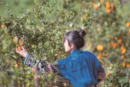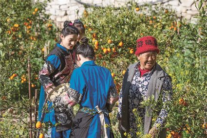 不遠(yuǎn)處,農(nóng)家大哥左握微型秤,旁邊框框紅艷艷草莓待稱,右拿手機(jī)收付款。穿過溪流木橋,黃四娘家青果累累,爍爍梨花下,女兒正梳妝挽云鬢;沈家河壩菜花黃黃,別院人聲鼎沸。遙想當(dāng)年,坡陡路險(xiǎn)。而今,鄉(xiāng)村振興,片片梯田,阡陌交通,戶戶通路。雨天一身泥,晴天一身灰已不復(fù)返。
