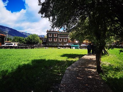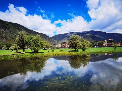 夏日,暖陽(yáng)溫柔,沿途入眼皆是綠意。聽說(shuō),俄色花盛放的時(shí)候,潔白的花成簇成團(tuán),一樹樹漫山遍野,像九天的云朵堆滿山谷田野,汽車從公路疾馳,風(fēng)里都是俄色的清香。我們來(lái)的時(shí)候稍微遲了,錯(cuò)過(guò)了俄色的花期,花開荼蘼,殘花在蒼翠的枝葉里躲藏,風(fēng)里是飛舞的花瓣,紛紛揚(yáng)揚(yáng),在棕紅的棧道鋪成白色的云錦,樹下是芬芳的余味。棧道邊,金黃的雪白的野花鋪灑在翠綠的草甸上,像濃烈的水彩。地里的青稞,綠得晃人眼睛,綿延的是木雅人勤勞與希望。遠(yuǎn)處,木雅民居在各種深綠淺綠的陪襯下更加的濃墨重彩。