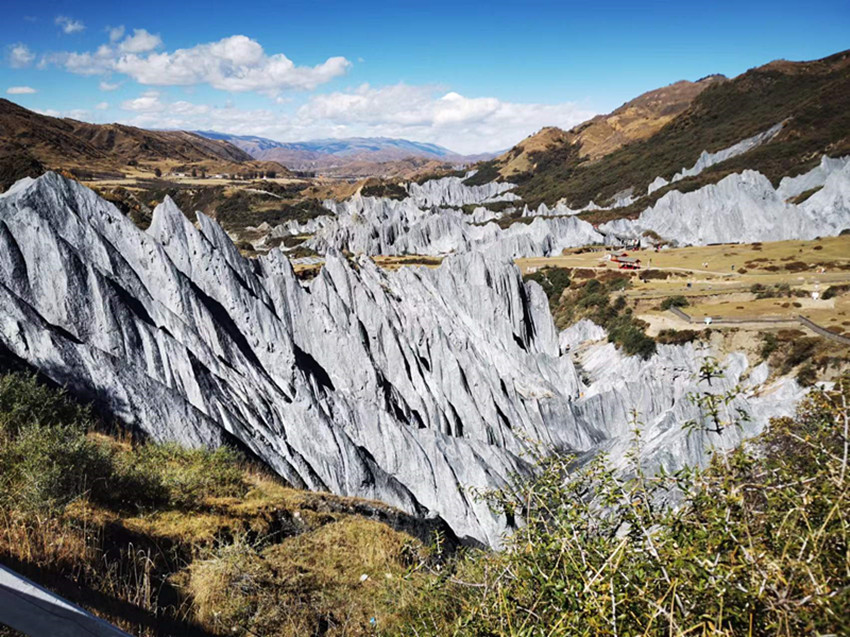 墨石公園的石林,分布在雅礱江支流慶大河的東側(cè)坡地上,川藏公路從旁經(jīng)過。離開公路,沿一條小路行幾百米,就是觀景臺。