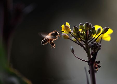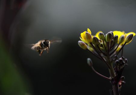 千百年來(lái),許多小宗蔬菜的傳宗接代依靠中華蜜蜂授粉。紫油菜花在初春開放,這個(gè)季節(jié)西方蜜蜂因畏寒仍在巢中被人工飼養(yǎng),只有中華蜜蜂不怕寒冷,不嫌花源稀少,只要?dú)鉁剡_(dá)到8℃,它們就出勤了。 熊小立圖文 攝于成都