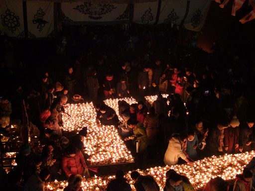 康定的幾座黃教寺廟舉行了法會,擺酥油花,燃元根燈供佛。信教群眾除在家供燈外,有的還登跑馬山,赴南無寺敬燈油。入夜后又成群結(jié)隊涌向康定城中的安覺寺,參加元根燈會,以此紀念藏傳佛教格魯派創(chuàng)始人、宗喀巴大師圓寂成佛。安覺寺里人潮涌動,熱鬧非凡。有扶老攜幼的信教群眾,有祈求平安的生意人,也有慕名而來的外地攝影師。燈會這天,最忙碌的除了寺廟里的喇嘛,就數(shù)在寺廟周圍站崗的消防員了,消防員李剛說:“一大早就有遠道而來的信教群眾和僧尼到寺廟里點燈了,為了保障寺廟的消防安全,我們已經(jīng)在這飄著雪花的冬日里站了整整一天了,要等到每一盞燈都安全的燃盡,我們才可收隊離開。”