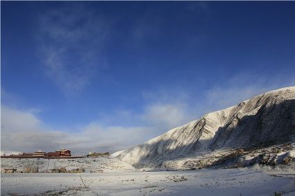 到達(dá)滿金寺,雪已經(jīng)離我們很遠(yuǎn)了,它停留在了溫拖地區(qū)的群山之上。陽光很溫暖,金沙江水似乎也有了初春的體溫。上萬畝青稞地還是高原上三月份應(yīng)有的土黃色,它透著一種簡(jiǎn)單和直白。我開始胡亂聯(lián)想:這些簡(jiǎn)單的土黃色是否就是大雪融化之后的另一種色彩。望著對(duì)岸的滿金寺,混合著自己的想象,我寫下一首不那么貼切的詩(shī),詩(shī)中再次出現(xiàn)了雪: