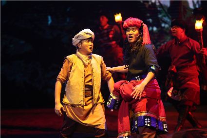 音樂劇《康定情歌》從傳統(tǒng)的男女情上升到了民族的大愛,一幅神秘多彩的藏民族風(fēng)情畫卷緩緩鋪開,一個動人的關(guān)于“情”的傳說,一個追尋“愛”的故事讓心靈微微一顫。從相識、阻情、定情、思念、生離到永生,講述了馬幫漢子華君帶著他的馬幫隊伍來到神秘的康巴地區(qū),在這里,他結(jié)識了美麗、善良、多情的康巴姑娘康珠,也結(jié)識了勤勞、勇敢、正直的康巴漢子,他(她)們共同經(jīng)歷了世間最真摯的民族情、友情、愛情、親情,譜寫了一曲曲愛的神話,彰顯了康巴地區(qū)自然和諧的無窮魅力。