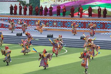 7月29日,來(lái)自四川省道孚縣各地的上萬(wàn)名藏族群眾在道孚中學(xué)載歌載舞,歡慶第三屆安巴農(nóng)耕文化旅游節(jié)。安巴在藏語(yǔ)中是五月的意思,藏歷五月正值農(nóng)閑時(shí)期,藏族群眾都會(huì)舉行各種活動(dòng),祈禱風(fēng)調(diào)雨順,吉祥平安。