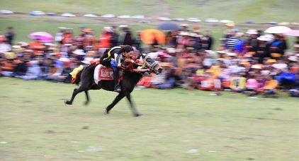 7月23日,四川甘孜藏族自治州理塘縣村戈鄉(xiāng)賽馬活動(dòng)開始,牧民們?cè)隈R背上一顯身手。每年藏歷六月,當(dāng)草原上格?;ㄊ㈤_的時(shí)候,四川省理塘縣24個(gè)鄉(xiāng)(鎮(zhèn))就會(huì)按照習(xí)俗舉辦隆重的賽馬會(huì)來拜祭神山,慶祝豐收。迄今有400多年歷史的賽馬分為耐力賽、小走賽、馬術(shù)賽等,其中最為精彩的是馬術(shù)賽:馬肚藏身、馬背倒立、飛騎射擊、拾哈達(dá)等,驚險(xiǎn)刺激。2008年6月,此項(xiàng)活動(dòng)被列入四川省級(jí)非物質(zhì)文化遺產(chǎn)保護(hù)項(xiàng)目。(朱虹 葉強(qiáng)平)