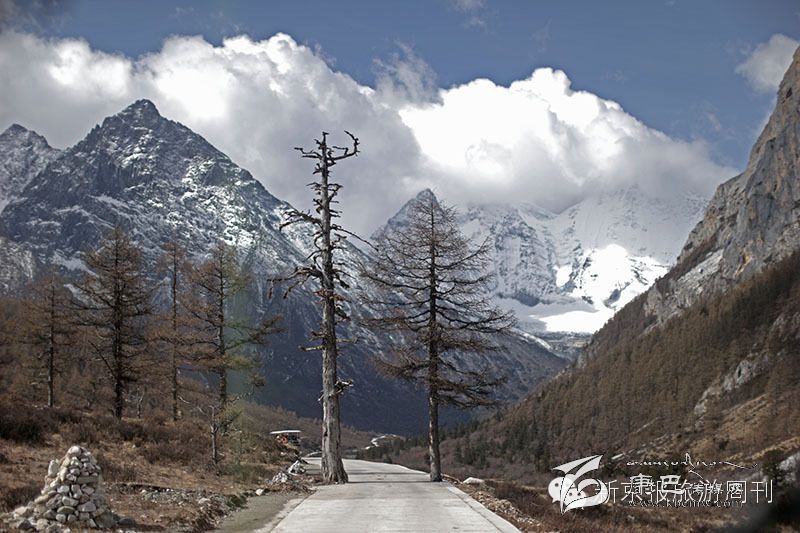 在海報(bào)4000多米的亞丁景區(qū),幾名當(dāng)?shù)鼐用癖持剡_(dá)百余斤物品走五公里往牛奶河居住地。通往洛絨牛場(chǎng)的山路。