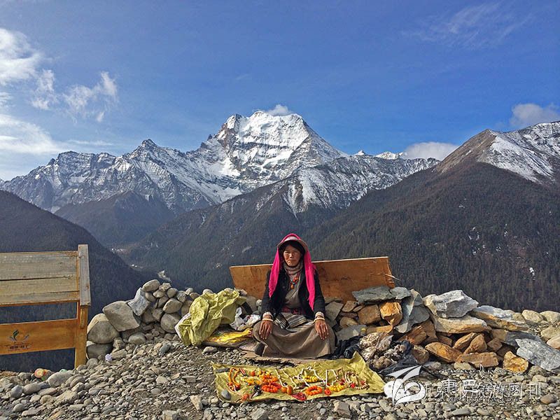 那姆說的那一座打敗她的雪山是仙乃日,亞丁的三座雪山之一,其他兩座是夏諾多吉和央邁勇。我們在仙乃日的觀景臺拍照,一個藏族婦人端坐在埡口,來來往往的游客把她和雪山的背景攝入鏡頭。有個亞丁鎮(zhèn)的人搭乘了我們的大巴,他站在埡口,從衣服里拿出一疊風(fēng)馬旗,朝天空揮灑,五顏六色紛紛揚揚。在藏區(qū),神山的埡口,經(jīng)常能夠看到揮灑風(fēng)馬旗的人,祝福長路,愿你一路平安。