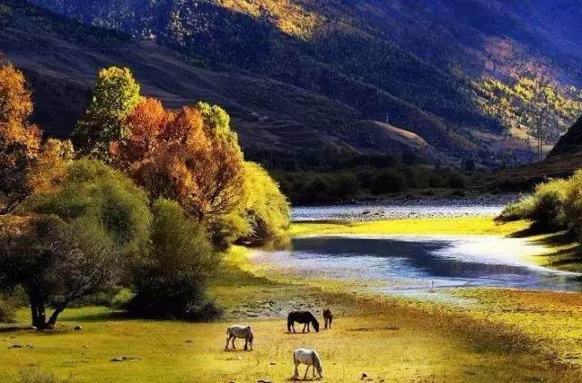 秋季,是稻城亞丁最具有詩意的季節(jié)。火紅、金黃、碧藍是自然這位大藝術家收藏已久最珍貴的顏料,這瞬間被洋洋灑灑潑灑在這天地之間。無論從什么角度看,取景框永遠是一幅美麗的畫面。