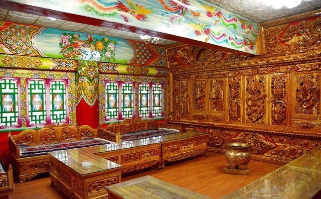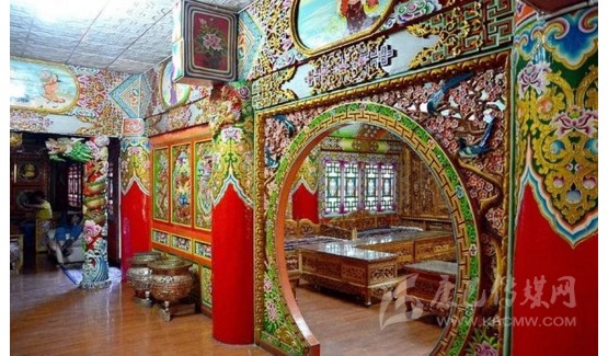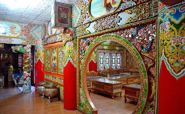 道孚民居室內(nèi)精雕細(xì)鏤,描金繪彩,每一個(gè)圖案或圖畫(huà)就是一個(gè)吉祥物或一個(gè)傳說(shuō)。民居客廳陳設(shè)豪華,富麗堂皇,極顯主人的富有;經(jīng)堂供奉佛像,酥油燈長(zhǎng)明,是家中的清靜之地;臥室多用箱式或椅式藏床,陳設(shè)溫馨而別具風(fēng)情。
