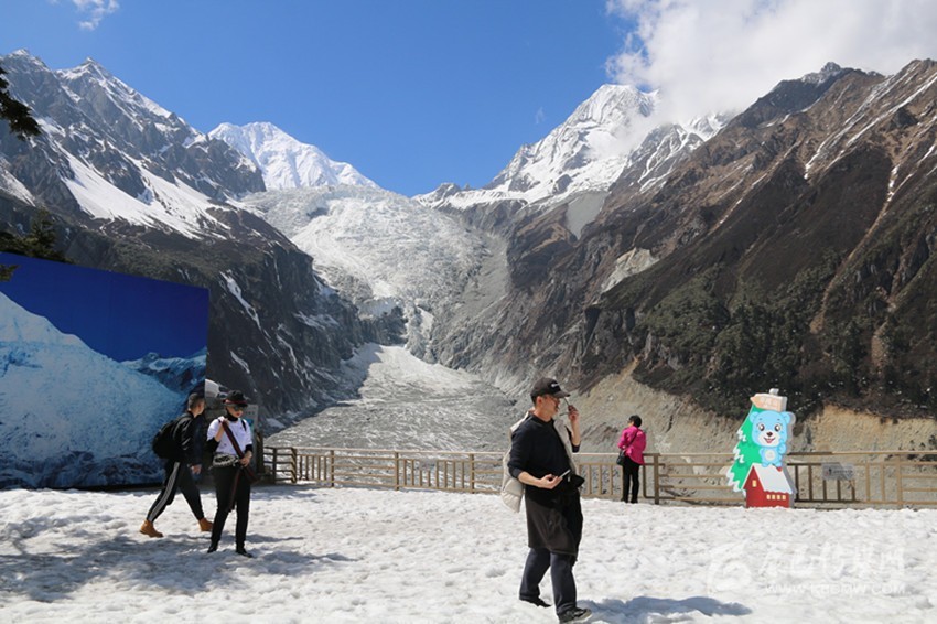 貢嘎雪山白雪皚皚,祥云環(huán)繞,大冰瀑布潔白如玉。連日來的晴好天氣,使得圣潔的海螺溝冰川一覽無余,美得令人窒息。3月26日,來自成都市郫都區(qū)的王先生在冰川觀景臺摘下口罩,貪婪地呼吸著新鮮空氣,舉著相機狂拍不停。“我來過海螺溝幾次,因為天氣原因,難得一見冰川的‘真容’,今天天氣好,雪峰潔白耀眼,像亭亭玉立的少女,能夠一睹海螺溝冰川風(fēng)采,真是很幸運?!笔?疫情影響,王先生已經(jīng)宅家兩個月了,“感覺像關(guān)在籠子里一樣,心情壓抑”。目前,他工作的汽車廠還沒有復(fù)工,便迫不及待地自駕獨自西行來到海螺溝。