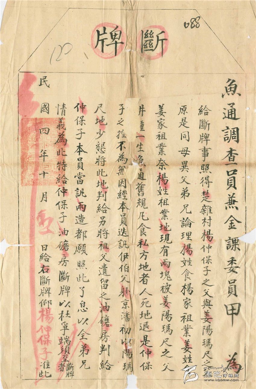 這張“斷牌”說(shuō)的事情發(fā)生在“民國(guó)4年”(公元1915年),用今天的眼光來(lái)看應(yīng)算是一件“民事糾紛”。在一處地名“楚雜村”的地方,一個(gè)叫“楊仲保子”的人和一個(gè)叫“姜陽(yáng)瑪尺”的人因?yàn)楦厮袡?quán)的事發(fā)生了糾紛。這兩個(gè)人其實(shí)是同母異父的兄弟。為了平息兩個(gè)人之間糾紛,也是為了保全兄弟情誼,又從公平角度出發(fā),甲調(diào)查員就把一處“油磨房”斷給“楊”姓所有。事情就這么斷了,為了防止以后再為這事發(fā)生糾葛,甲安仁調(diào)查員就發(fā)出了這樣一張可以作為“憑證”,其實(shí)是在當(dāng)年的那種情形下具有法律效力的“證書”。