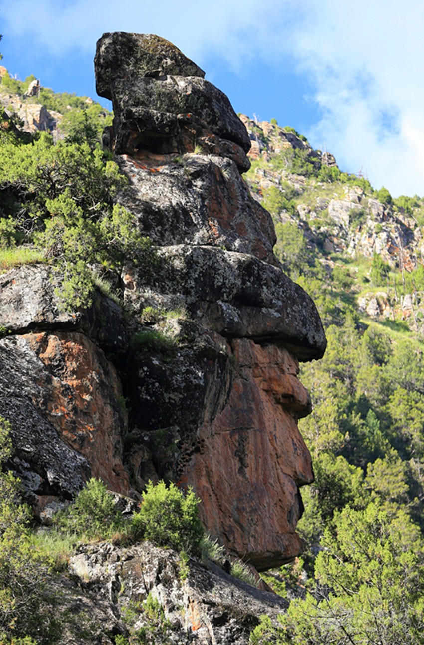 從多爾家溝口走7公里到日貢多時(shí),在右側(cè)的山巖上發(fā)現(xiàn)了一處自然形成的人頭像。耳、眉、眼、口、鼻五官形象逼真,還穿戴著帽子和盔甲,第一眼看見(jiàn)就不禁聯(lián)想到格薩爾藏戲面具和格薩爾石刻中的格薩爾王形象。