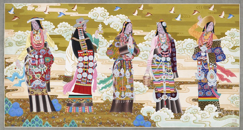 青藏高原有著曠遠(yuǎn)弘大的人文地理,有著神秘久遠(yuǎn)的宗教文化傳承,正是這蒼茫大地孕育了藏族人;正是這片極度追求審美體驗(yàn)并把生活高度藝術(shù)化的疆域,滋養(yǎng)了西藏藝術(shù)。從早期的巖畫、旗幡畫、唐卡、壁畫,再到當(dāng)代的丹青重彩,無不生發(fā)于這片神奇高原,皆是中華民族文化寶庫中燦爛的牟尼寶珠。唐卡繪畫肇啟于松贊干布隆興之時,向南學(xué)習(xí)印度、尼泊爾布畫,往西受到犍陀羅藝術(shù)浸潤,向東融合唐、宋、明、清之審美,再集藏地宗教文化、民族審美熔為一爐,鑄就一千三百年唐卡繪畫之法脈。它不僅是獨(dú)具魅力的藏文化之血脈源流,更是各民族文化交融、和諧互生的典范,對世界藝術(shù)有著深遠(yuǎn)的影響。