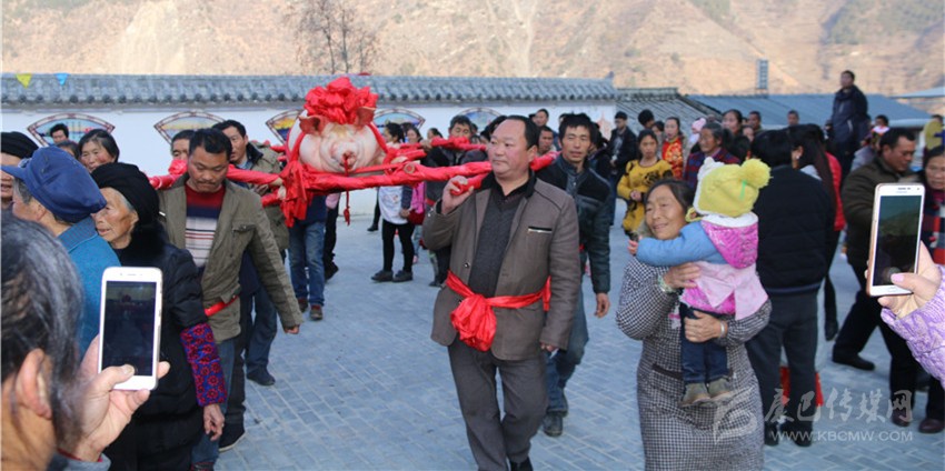 5個(gè)村民將年豬抬到秤上。360斤。村民為年豬準(zhǔn)備大紅花。準(zhǔn)備紙錢、香蠟。9點(diǎn)整,殺豬匠開始了他的工作,在眾人齊心協(xié)力下,光溜溜的年豬被打整干凈。“保佑我們村來年風(fēng)調(diào)雨順、五谷豐登,村民平安健康?!贝逯欣险呔催^天地后,8個(gè)身強(qiáng)力壯的村民站在年豬旁,豎著拇指齊聲說,今年家家戶戶還要養(yǎng)大肥豬。抬著年豬,村里的中老年人簇?fù)碇?,走在最前面,唱著悅耳的民謠,大意是歌唱幸福生活的,迎著2018年的第一縷陽光,村民們喜氣洋洋。到村里來的游客蜂擁拍照。