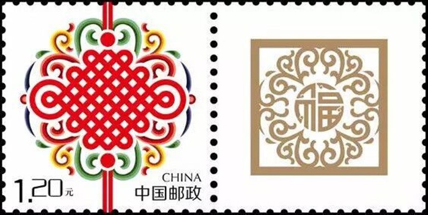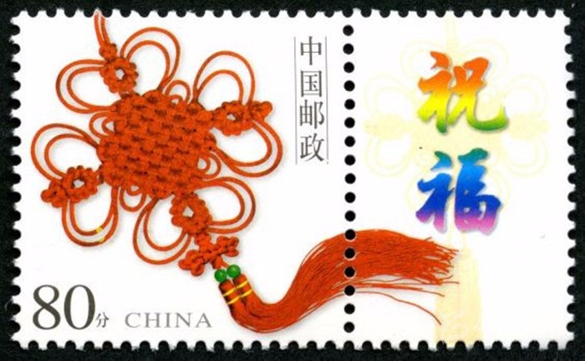 2002年5月10日,中國(guó)郵政發(fā)行《如意》個(gè)性化服務(wù)專用郵票一枚。主票圖案為如意柄端系著一個(gè)紅色“中國(guó)結(jié)”,附票有“祝福”二字; 2003年3月3日,中國(guó)郵政發(fā)行《同心結(jié)》個(gè)性化服務(wù)專用郵票一枚。主票圖案為盤(pán)長(zhǎng)結(jié)4邊編織有心型繩結(jié)的同心結(jié),附票為“祝?!倍?;2006年9月25日,中國(guó)郵政發(fā)行《中華全國(guó)歸國(guó)華僑聯(lián)合會(huì)成立五十周年》紀(jì)念郵票一枚。圖案為阿拉伯?dāng)?shù)字“5”與中華全國(guó)歸國(guó)華僑聯(lián)合會(huì)圓形會(huì)徽組成數(shù)字“50”,象征全國(guó)僑聯(lián)五十周年,背景畫(huà)面為淡淡的粉紅色“中國(guó)結(jié)”。寓意歸國(guó)華僑與全國(guó)人民血肉相連,同心同德共同建設(shè)美好家園;2013年8月8日,中國(guó)郵政發(fā)行一枚《美好祝?!焚R卡專用郵票,圖案為象征喜慶的紅色“中國(guó)結(jié)”;2014年9月20日,中國(guó)郵政發(fā)行《中國(guó)夢(mèng)(二)——民族振興》特種郵票,其中第四枚“民族團(tuán)結(jié)”,圖案中載歌載舞的各民族群眾上方有一個(gè)大紅的“中國(guó)結(jié)”,象征著各民族大團(tuán)結(jié)。