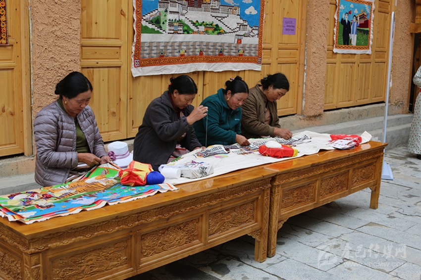 在藏繡展點(diǎn),5名農(nóng)牧民婦女正在合繡一幅藏族建筑刺繡作品?!拔覐?6歲開始跟著父親學(xué)藏繡,傳到我這已經(jīng)是第四代了。除了‘六長壽’、度母像等傳統(tǒng)圖案,今年是新中國成立70周年,我還繡了一幅天安門作品?!?7歲的傳承人達(dá)打介紹道。