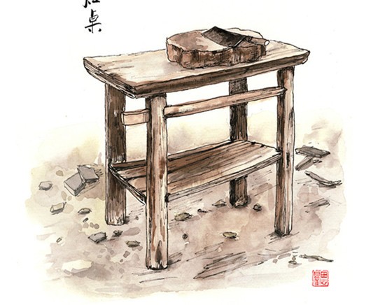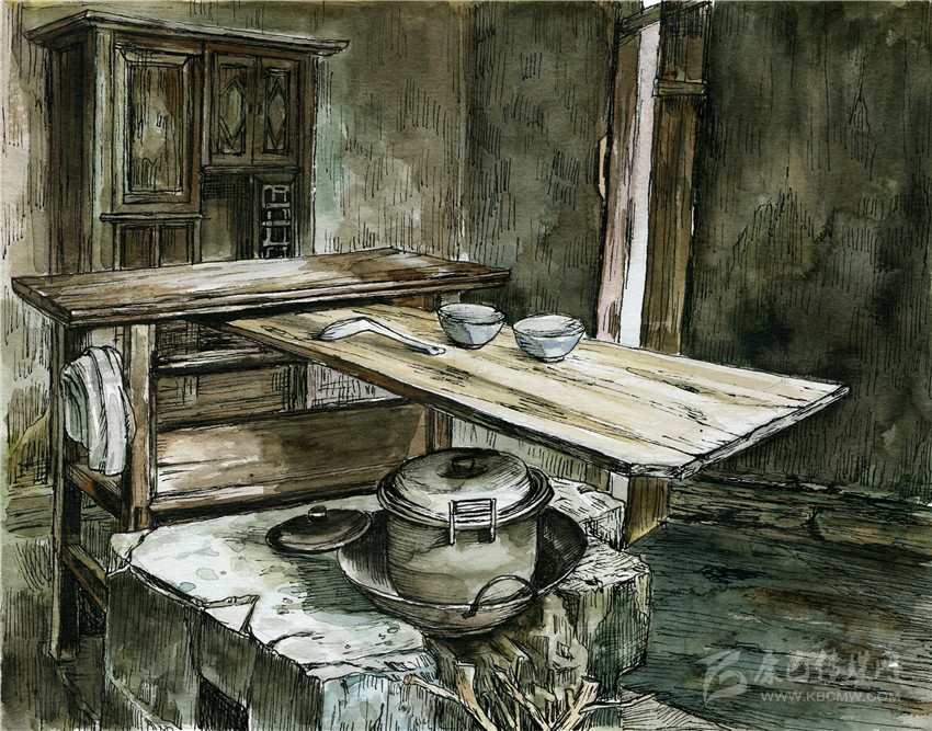 在我們家,灶屋里砌著一個(gè)四方形兩灶孔的大正灶,兩條寬板長(zhǎng)凳靠墻擺放,交于墻角,像木匠的大曲尺,半圍著象征一家之主的正灶,其中一條正對(duì)著灶門(mén)口。灶與凳之間的通道,僅容曲膝而坐。灶上常年擱著烏黑的鼎灌和鐵鍋,灶的背面則立著一張長(zhǎng)條狀的灶桌。灶桌是洗碗和切菜的地方,在其橫長(zhǎng)的縫隙里插上接手板,懸空于灶面之上,擺上碗筷,又起到了飯桌的功能。灶屋進(jìn)門(mén)的另一面墻,靠墻而立的,是高高的碗欃和一個(gè)瓦水缸。碗欃是平素放碗放剩菜的地方,本是漆了老紅色,卻因西墻的木格窗小,光線幽暗,與四壁及樓板的烏黑融為了一體。水缸上口有一塊擱板,板上放兩只寬口瓦缽,缽里各放著一只竹筒水勺,一大一小。每天早晚,家人擔(dān)了木桶,挑來(lái)井水倒入水缸,此處的地面,長(zhǎng)年潮濕。灶屋是我們一日三餐吃飯喝茶休息閑談的場(chǎng)所,煙火歲月,多是在此度過(guò)。我開(kāi)蒙上小學(xué)后,每到夜晚,吃過(guò)飯后,將煤油燈盞移到寬板長(zhǎng)凳,雙膝跪地,伏在凳灶之間的空隙里寫(xiě)作業(yè),有時(shí)一不小心,額前頭發(fā)就被燈盞的火焰燒得焦臭。我自小愛(ài)學(xué)習(xí),成績(jī)很好,每學(xué)期都有獎(jiǎng)狀,老師夜里來(lái)村間家訪時(shí),也常來(lái)我家坐,是我父母最大的榮光。