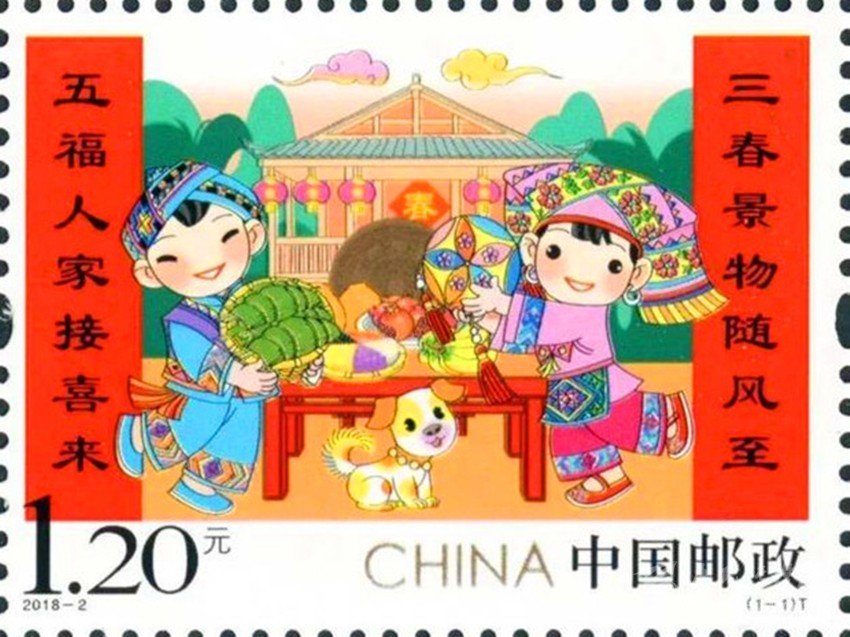 彰顯中華民族特有人情味的拜年郵票。拜年是我國春節(jié)的主要習(xí)俗,是中華民族優(yōu)秀的傳統(tǒng)文化,是人與人之間情感凝聚和維系的重要禮節(jié),具有獨特人情味。中國郵政從2015年至2019年連續(xù)發(fā)行了五組“拜年”系列郵票。2015年中國郵政發(fā)行的第一組《拜年》郵票,以其獨特的卡通風(fēng)格和濃郁的民俗特色,展現(xiàn)了人們過大年,拜大年時的喜悅場景。2018年正好是廣西壯族自治區(qū)成立六十周年,中國郵政發(fā)行 《拜年》郵票,畫面展現(xiàn)了壯家人過年時熱情好客的場景,桌子上擺放著柚子、香蕉、五色飯等當(dāng)?shù)靥厣褪澄?,打開的石榴籽粒飽滿、顆顆相抱,正如我國56個民族緊密團結(jié)在一起,形象貼切地體現(xiàn)了習(xí)近平總書記提出的“各民族要像石榴籽那樣緊緊抱在一起”的教導(dǎo)。 2019年春節(jié)恰逢與藏歷新年同一天,中國郵政發(fā)行的《拜年》郵票,郵票主圖畫面上“歡歡”與“喜喜”兩名藏族兒童,身穿藏族的盛裝,在布達(dá)拉宮前載歌載舞,整個畫面展現(xiàn)了藏族同胞歡快愉悅,喜慶新年的畫面,同時也表達(dá)了全國各族人民在黨的領(lǐng)導(dǎo)下,幸福生活,共筑中國夢的美好寓意。