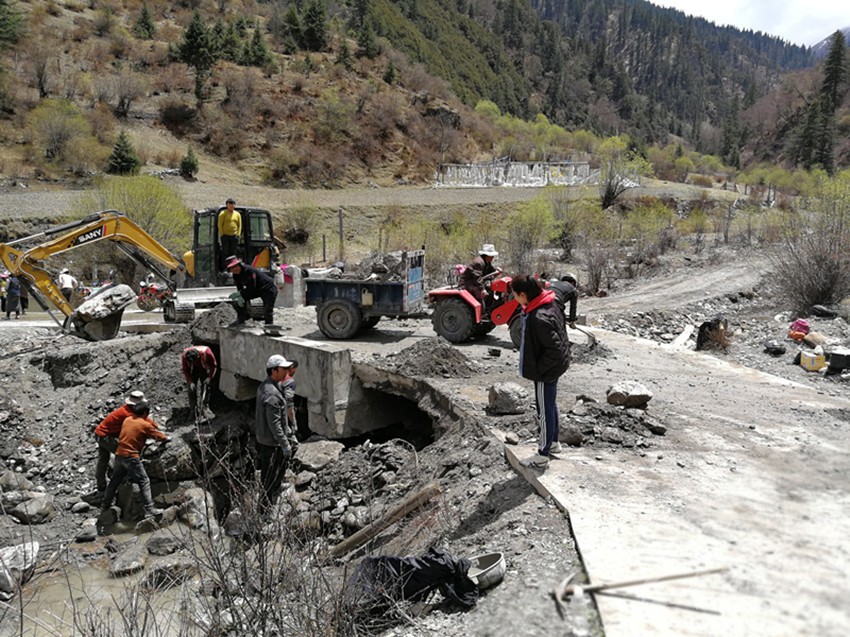 或許是在雨季,泥石流將通村的路都阻斷了,我們和大家一起拿著工具,搶修通村路的時候;