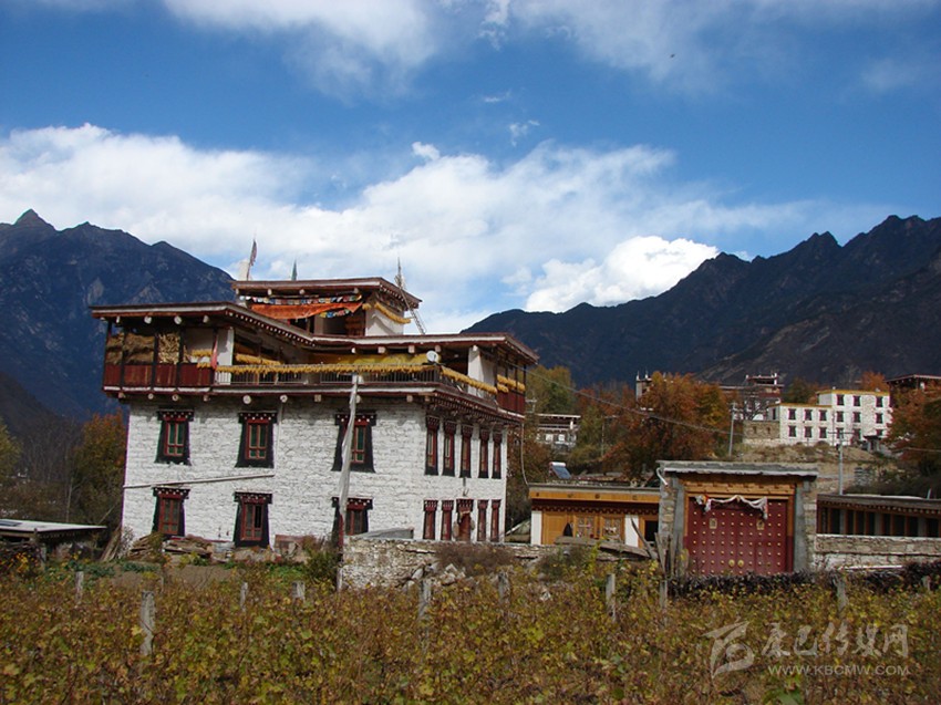 當(dāng)翻過(guò)一處斷崖,眼前豁然開朗。一大片平整的田地出現(xiàn)在我們的面前。田地里,一棟棟白色的藏房或鶴立雞群,或三五聚集,看似毫無(wú)規(guī)律,其實(shí)從整個(gè)房屋大門的朝向可以看出,在房基的選擇時(shí),對(duì)陽(yáng)光的接納面、風(fēng)水等都作了充分的考慮。