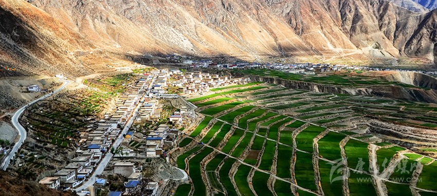 從得榮縣城出發(fā),途經(jīng)日龍鄉(xiāng),汽車(chē)順著盤(pán)山公路開(kāi)始往下行駛,到半山腰處,司機(jī)輕輕踩一腳剎車(chē)熄火,在此作短暫休息。這時(shí),我打開(kāi)車(chē)門(mén)俯瞰金沙江畔的因都?jí)?,但?jiàn)公路兩側(cè)一排排整齊的房屋像火柴盒一樣連綴在平坦壩子上,房屋下端,麥田梯次舒展,麥浪涌動(dòng),蔚為壯觀。
