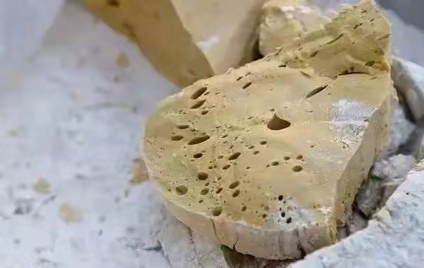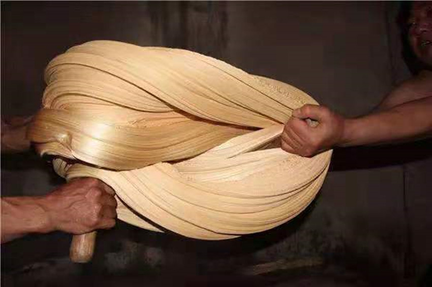 扯糖也是熬糖過程中十分關(guān)鍵的一個(gè)環(huán)節(jié)。剛出鍋的糖溫度可達(dá)兩三百度,徒手是不敢去觸碰的,扯糖需等到麻糖變得溫?zé)岵拍苓M(jìn)行,但又必須在它完全冷卻之前完成整個(gè)扯糖工序,否則等麻糖徹底冷卻就會(huì)變得僵硬無比。休息少頃,只見三叔熟練的用粘著面粉的手從盛放麻糖的簸箕中扯下三四斤左右的一團(tuán)麻糖,左手拿糖右手持杖(類似于搟面杖的木棍)作出扯糖的姿勢,此時(shí)四叔拿著早已準(zhǔn)備好的沾了面粉的木棍將三叔的手中的麻糖攔腰別住,用力均勻的拉扯麻糖,三叔則在原地扎樁站穩(wěn),一手持杖作拉扯狀,一手微微扶住想要往下掉的糖尾,經(jīng)過幾次折疊和來回拉扯,麻糖變得均勻細(xì)長,兩人合力將扯好的麻糖平穩(wěn)的放在鋪有熟面粉的大簸箕中靜待冷卻。間隙二叔和父親又重復(fù)著扯糖的動(dòng)作,很快將一團(tuán)糖餅扯成糖帶。經(jīng)過拉扯后麻糖中間會(huì)形成很多的空洞,吃起來酥脆香甜。