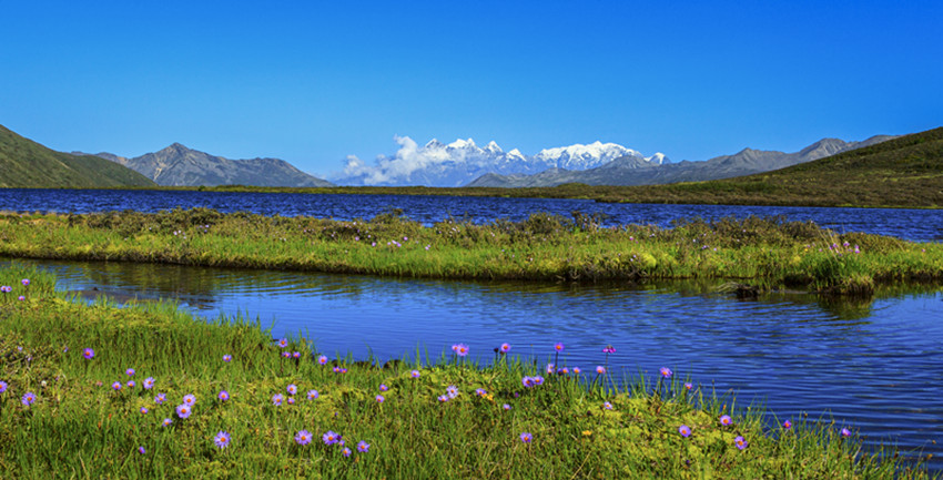 在山谷中穿行十余公里,路面一點點抬起,上了貢嘎山脈,徑直進(jìn)入康定情歌景區(qū)。隨著海拔的升高,涼意漸濃。山依舊是主角,地勢卻變得平緩而開闊,有茵茵的草地,有大小湖泊,沿途山泉潺潺,野花點綴,空氣清幽,方才單調(diào)的褐色很快被淡忘。山體漸次出現(xiàn)密集而低矮的灌木,枝條筆直地立著,有高寒山區(qū)的凜然之氣。灌木一層層上延,樹木雜多,大片的原始森林漫過山體,將大山包裹起來。遠(yuǎn)處,藍(lán)天白云之下,貢嘎雪山在群峰中探出頭來,擦亮高空的陽光。澄明的空氣里,仿佛可以聽見雪??┛┑匦Αx那間,仿佛所有的大山,都開始舒展筋骨。