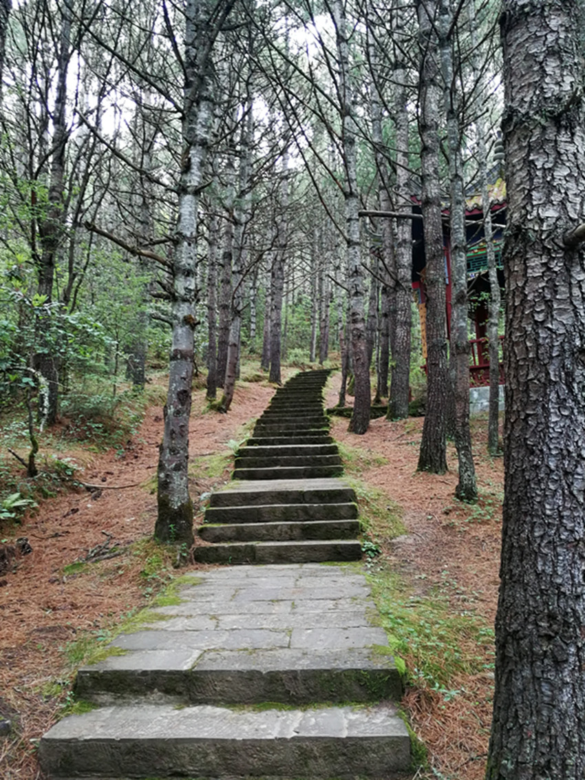 跑馬山腳的國道過境公路康定人都叫它后山公路。在后山公路觀音閣上行百米遠(yuǎn)地方,離公路坎三十公尺遠(yuǎn)近,有一處突兀于山坡樹林的巖頭,晃如一只臥獅探出的頭,那巖頭就是跑馬山獅子巖。此獅子巖自然不是彼獅子巖了。去四道巖的小徑就要從獅子巖傍邊經(jīng)過。那巖頭下如獅子的下頜處人為的砌了一個土石混合的條狀臺階,從我記事起就知道上面經(jīng)常供有一些食物瓜果紙張之類的供品。當(dāng)然那時候我們也常常把花紅、梨子放在那臺上,以示敬神。但具體敬的什么神靈或土地老仙,我則從未想過,這差不多就是一個習(xí)俗而已。