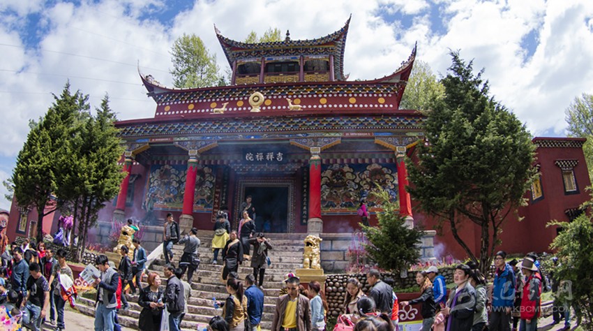 出亭數(shù)步,即可望見掩映在綠樹叢中的“吉祥禪院”,巍峨雄偉,金壁輝煌。進(jìn)得大殿,一尊釋迦牟尼塑像栩栩如生,四壁神畫多為佛經(jīng)故事。轉(zhuǎn)過側(cè)殿,就是高達(dá)二十余米的“凌云白塔”了。這座用白石作塔座,以金屬飾塔頂?shù)姆鹚桥荞R山公園主要景觀之一。