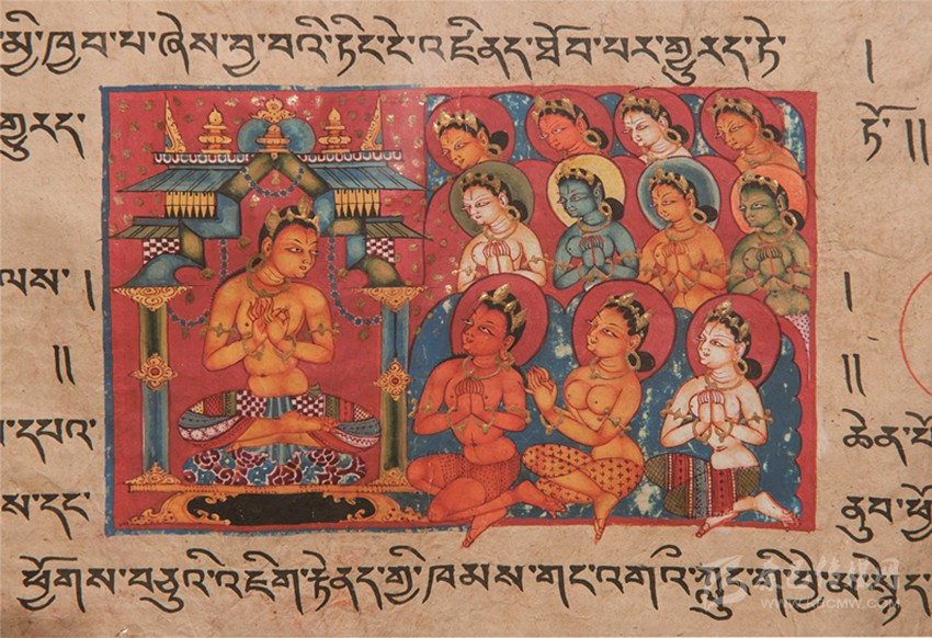 酥油燈點(diǎn)了一天又一年,千載之后墻壁熏得黝黑,曾經(jīng)絢爛無比的丹青圖畫就潛藏在這黝黑里,若隱若現(xiàn);一幀一鋪既是圣者傳奇,也是故國的見證。一頁帶插圖的經(jīng)書陳列在墻角柜子里,看守喇嘛捧與我們頂禮膜拜。經(jīng)書上畫著佛的前世(或某位菩薩)在廟堂上說法,雙手結(jié)說法印、上身著金釧瓔珞、下身著彩裙、跏趺坐于錦墊之上。他目光溫和注視著信眾,講到妙處有金色天花墜落。十一位華美的各色婦人蹲踞于前、雙手合十聆聽;前排三人抬頭看見空中落下的花雨,不禁歡喜贊嘆……