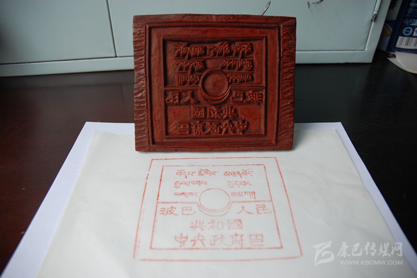 日月同輝的造型、藏漢雙語(yǔ)的文字,這一枚木質(zhì)印章,高1.5厘米,長(zhǎng)寬皆為12厘米,印面刻著藏漢雙語(yǔ)“波巴人民共和國(guó)中央人民政府印”。