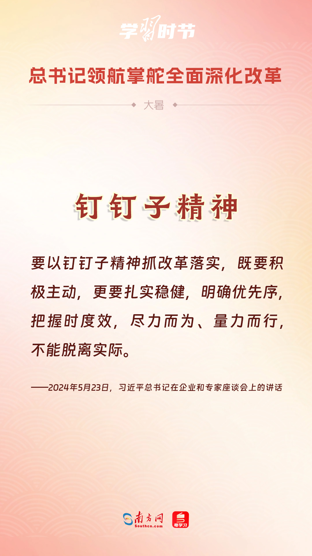 黨的十八大以來(lái),習(xí)近平總書(shū)記親自領(lǐng)導(dǎo)、親自部署、親自推動(dòng)全面深化改革工作,推動(dòng)全面深化改革事業(yè)在攻堅(jiān)克難中不斷邁上新臺(tái)階、取得新勝利。在驕陽(yáng)似火的大暑時(shí)節(jié),通過(guò)一組海報(bào),讓我們共同學(xué)習(xí)習(xí)近平總書(shū)記關(guān)于“全面深化改革”的重要論述。