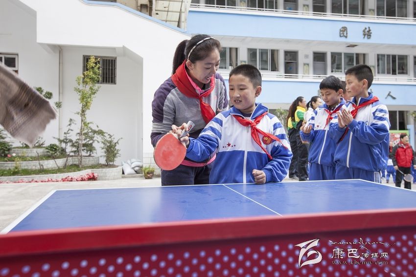 乒乓球冠軍牛劍鋒手把手教?hào)|大街小學(xué)學(xué)生打球。