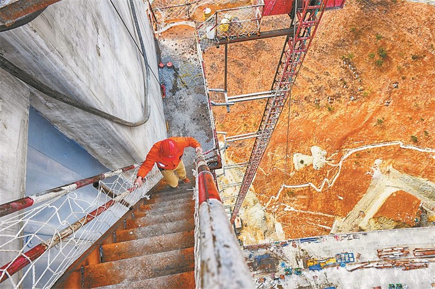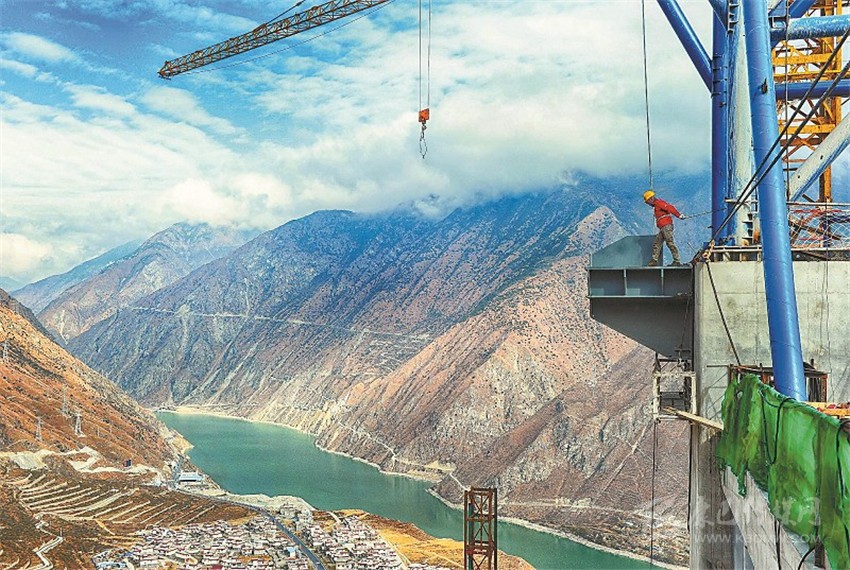 瀘定大渡河興康特大橋是雅康高速公路的重點(diǎn)控制性工程之一,是一座建在高海拔、高地震烈度帶上的超大跨徑鋼桁梁懸索橋,采用鋼混疊合橋道系,造價(jià)超過10億元,因建設(shè)技術(shù)難度大被譽(yù)為“川藏第一橋”。兩岸主墩索塔高188米,塔頂至河面垂直高差364米,橋橫跨大渡河,但在河中沒有橋墩,采取的是懸索橋設(shè)計(jì),在兩岸修建兩塔、兩錨,作為支撐和受力,橋面以懸索拉伸。未來(lái),大橋?qū)⒁?/span>1100米的超長(zhǎng)跨徑連通大渡河兩岸,變天塹為通途。 (何海洋 攝影報(bào)道)
