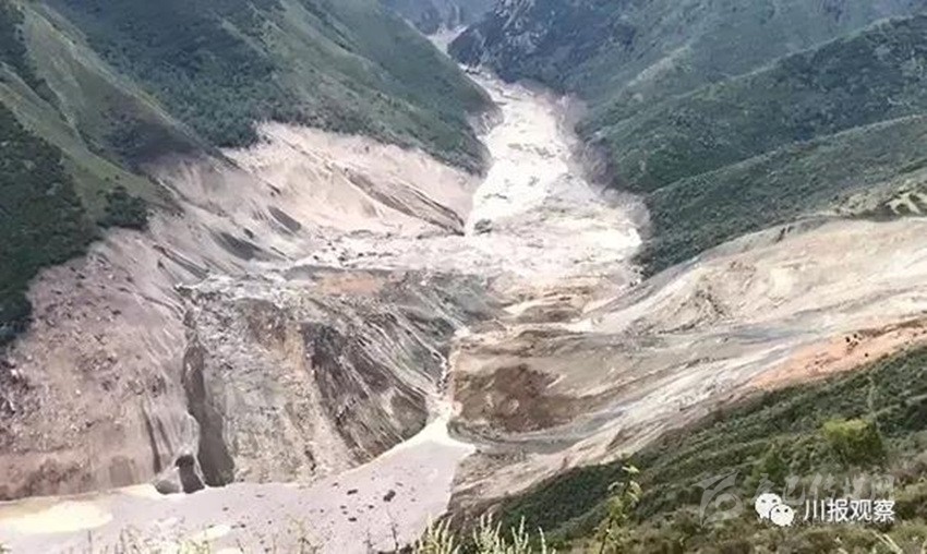 另?yè)?jù)四川省防指和四川省水利廳工作組反饋:堰塞湖所在江段長(zhǎng)約10.6公里,河谷為“V”形峽谷,兩側(cè)岸坡坡度20~60°,河谷結(jié)構(gòu)為斜向谷。河道上游彎曲、下游稍順直,水流急,局部稍緩。初步統(tǒng)計(jì),該段江段共有滑坡10處,崩塌3處,泥石流溝8條。其中有2處大型滑坡,即則學(xué)滑坡和仁達(dá)滑坡。