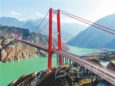 而在瀘定大渡河特大橋康定岸約200米處的公路堡坎上,寫著毛澤東主席的《七律·長(zhǎng)征》一詩(shī)。一句“大渡橋橫鐵索寒”道出了大渡河的艱險(xiǎn),而如今,在這波濤洶涌的大河上,建起了如此雄偉的大橋,解決了出行難題,帶來(lái)了福祉,將促進(jìn)藏區(qū)經(jīng)濟(jì)社會(huì)發(fā)展,真是讓“高原人民盡開顏”。
