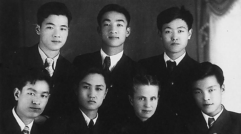 • 1949 年 6月1日,李鵬同志(后排左)在蘇聯(lián)伊萬(wàn)諾沃動(dòng)力學(xué)院補(bǔ)習(xí)數(shù)理化及俄文時(shí)與俄語(yǔ)教師費(fèi)德洛娃(前排左三)及同學(xué)合影。 新華社發(fā)