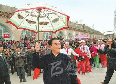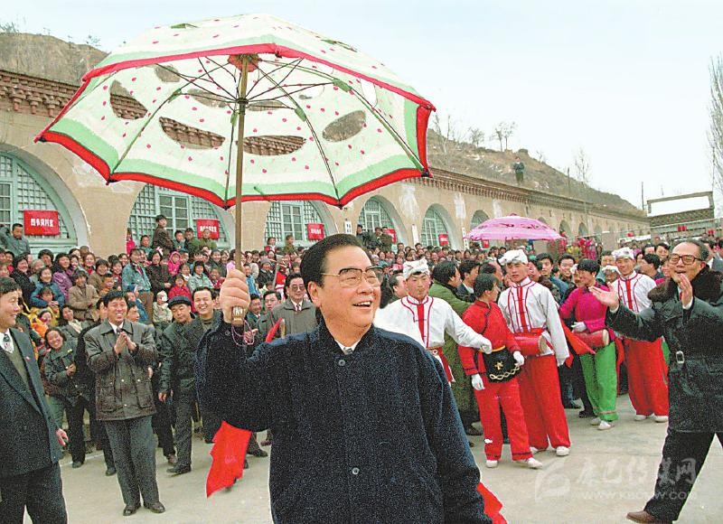 1996年2月19日至20日,李鵬同志回到闊別50年的延安,看望、慰問(wèn)延安地區(qū)的干部群眾,和老區(qū)人民一起過(guò)年。這是大年初一,李鵬同志同棗園村秧歌隊(duì)一起扭起陜北大秧歌。新華社記者 劉建國(guó) 攝