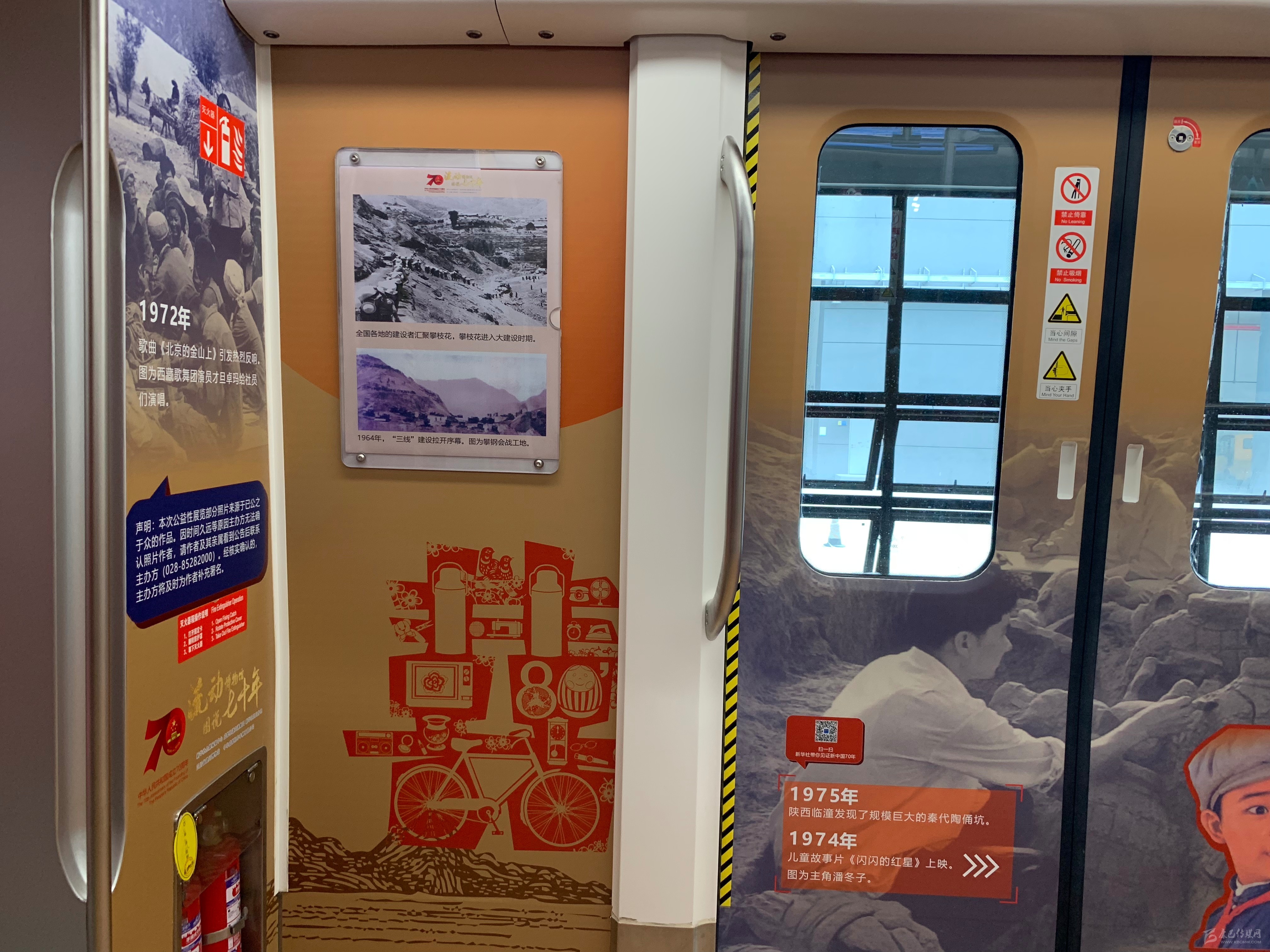這趟主題列車由新華通訊社與成都軌道交通集團(tuán)、四川省建川博物館、中車集團(tuán)成都公司共同打造。主辦方精心收集、挑選了1949-2019年的300多張重要?dú)v史照片和文物復(fù)印件,通過時(shí)間長(zhǎng)廊的設(shè)計(jì),將新中國(guó),特別是四川、成都70年的奮斗史和普通人衣食住行的巨大變化逐年呈現(xiàn)。主題列車上還設(shè)置了多處二維碼,掃碼即可進(jìn)入主辦方開設(shè)的更多專題,把“流動(dòng)博物館”延伸到“網(wǎng)絡(luò)博物館”。