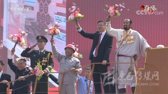 揮舞著手中的花束,臉上洋溢著燦爛的笑容,站在“凝心鑄魂”方陣主題彩車(chē)上的其美多吉,一身白色藏族傳統(tǒng)服飾,引人矚目。