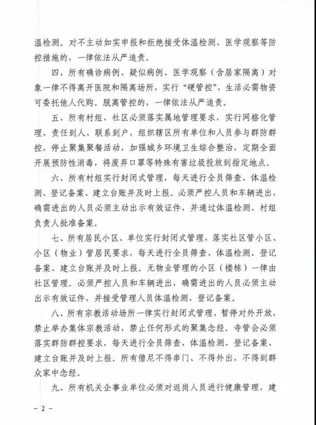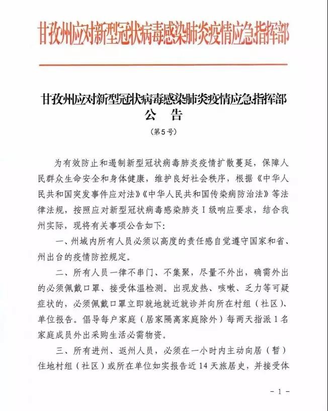 一、州域內(nèi)所有人員必須以高度的責(zé)任感自覺遵守國家和省、州出臺的疫情防控規(guī)定。二、所有人員一律不串門、不集聚,盡量不外出,確需外出的必須佩戴口罩、接受體溫檢測。出現(xiàn)發(fā)熱、咳嗽、乏力等可疑癥狀的,必須佩戴口罩立即就地就近就診并向所在村組(社區(qū))、單位報(bào)告。倡導(dǎo)每戶家庭(居家隔離家庭除外)每兩天指派1名家庭成員外出采購生活必需物資。三、所有進(jìn)州、返州人員,必須在一小時(shí)內(nèi)主動(dòng)向居(暫)住地村組(社區(qū))或所在單位如實(shí)報(bào)告近14天旅居史,并接受體溫檢測。對不主動(dòng)如實(shí)申報(bào)和拒絕接受體溫檢測、醫(yī)學(xué)觀察等防控措施的,一律依法從嚴(yán)追責(zé)。四、所有確診病例、疑似病例、醫(yī)學(xué)觀察(含居家隔離)對象一律不得離開醫(yī)院和隔離場所,實(shí)行“硬管控”,生活必需物資可委托他人代購。脫離管控的,一律依法從嚴(yán)追責(zé)。五、所有村組、社區(qū)必須落實(shí)屬地管理要求,實(shí)行網(wǎng)格化管理,責(zé)任到人、聯(lián)系到戶,組織轄區(qū)所有單位和人員參與群防群控,停止聚集聚餐活動(dòng),加強(qiáng)城鄉(xiāng)環(huán)境衛(wèi)生綜合整治,定期全面開展預(yù)防性消毒,將廢棄口罩等特殊有害垃圾投放到指定地點(diǎn)。六、所有村組實(shí)行封閉式管理,每天進(jìn)行全員篩查、體溫檢測、登記備案、建立臺賬并及時(shí)上報(bào)。必須嚴(yán)控人員和車輛進(jìn)出,確需進(jìn)出的人員必須主動(dòng)出示有效證件,并通過體溫檢測、村組負(fù)責(zé)人批準(zhǔn)備案。七、所有居民小區(qū)、單位實(shí)行封閉式管理,落實(shí)社區(qū)管小區(qū)、小區(qū)(物業(yè))管居民要求,每天進(jìn)行全員篩查、體溫檢測、登記備案、建立臺賬并及時(shí)上報(bào)。無物業(yè)管理的小區(qū)(樓棟)一律由社區(qū)管理。必須嚴(yán)控人員和車輛進(jìn)出,確需進(jìn)出的人員必須主動(dòng)出示有效證件,并接受管理人員體溫檢測、登記備案。八、所有宗教活動(dòng)場所一律實(shí)行封閉式管理、暫停對外開放,禁止舉辦集體宗教活動(dòng),禁止任何形式的聚集念經(jīng)。寺管會必須落實(shí)群防群控要求,每天進(jìn)行全員篩查、體溫檢測、登記備案、建立臺賬并及時(shí)上報(bào)。所有僧尼不得串門、不得外出,不得到群眾家中念經(jīng)。九、所有機(jī)關(guān)企事業(yè)單位必須對返崗人員進(jìn)行健康管理,建立管理臺賬,并向所在社區(qū)(村組)報(bào)備,對確認(rèn)無可疑癥狀的準(zhǔn)予返崗工作。單位食堂必須規(guī)范管理,實(shí)行分散就餐。十、非居民生活必需的公共場所一律關(guān)閉,經(jīng)批準(zhǔn)營業(yè)的公共場所中央空調(diào)一律關(guān)停。商場、超市、賓館、飯店、農(nóng)貿(mào)市場、公共客運(yùn)、個(gè)體商戶等市場經(jīng)營主體必須嚴(yán)格落實(shí)疫情防控措施,每天開展預(yù)防性消毒工作,從業(yè)和進(jìn)入人員一律佩戴口罩、檢測體溫、備案登記。藥店、診所、村衛(wèi)生室出售退燒、咳嗽類藥品必須實(shí)名制登記,并每日上報(bào)轄區(qū)疾控部門,對近14天有重點(diǎn)疫區(qū)旅居史的立即上報(bào)??爝f、外賣實(shí)行無接觸配送。十一、車站、機(jī)場和交通檢疫站點(diǎn)實(shí)行進(jìn)出人員全覆蓋體溫檢測和登記備案制度,對體溫異常人員立即采取就地就近隔離觀察。對拒絕配合的,公安機(jī)關(guān)依法協(xié)助強(qiáng)制執(zhí)行;對妨害執(zhí)行公務(wù)的,公安機(jī)關(guān)依法從嚴(yán)從重處理。十二、廣大黨員、干部、各級人大代表、政協(xié)委員要發(fā)揮帶頭作用,嚴(yán)格管好家人和親屬,積極主動(dòng)參與疫情防控工作,帶動(dòng)街坊鄰居自覺遵守相關(guān)規(guī)定。 本公告自發(fā)布之日起實(shí)施,終止日期另行公告。 甘孜州應(yīng)對新型冠狀病毒感染肺炎疫情應(yīng)急指揮部