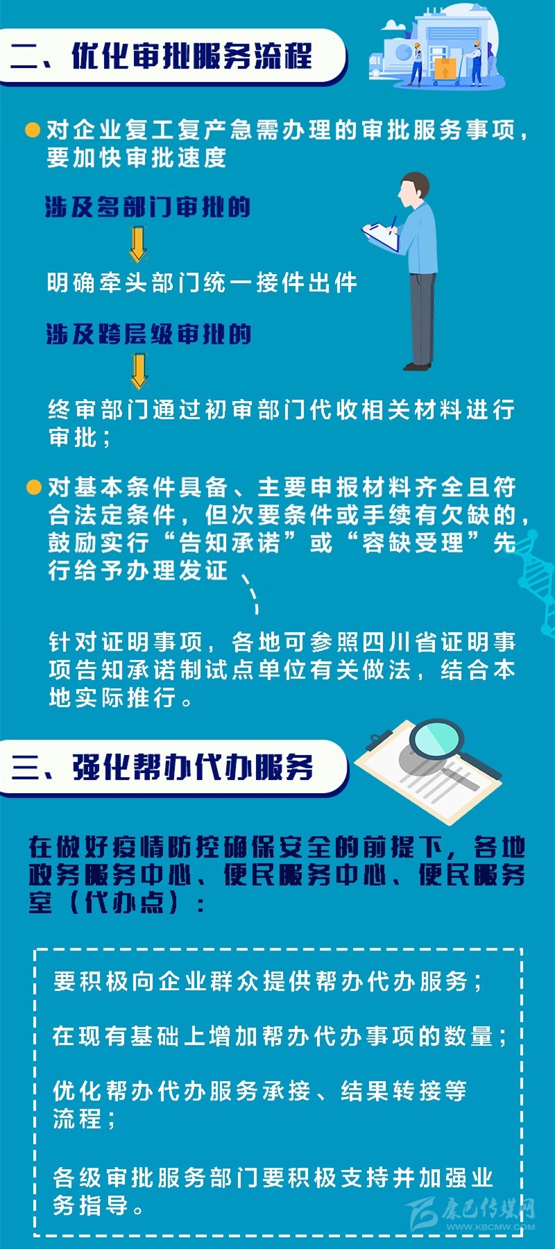 答:通知明確,各地政務(wù)服務(wù)中心、便民服務(wù)中心、便民服務(wù)室(代辦點(diǎn))要在做好疫情防控確保安全的前提下,積極向企業(yè)群眾提供幫辦代辦服務(wù),在現(xiàn)有基礎(chǔ)上增加幫辦代辦事項(xiàng)的數(shù)量,優(yōu)化幫辦代辦服務(wù)承接、結(jié)果轉(zhuǎn)接等流程,各級審批服務(wù)部門要積極支持并加強(qiáng)業(yè)務(wù)指導(dǎo)。