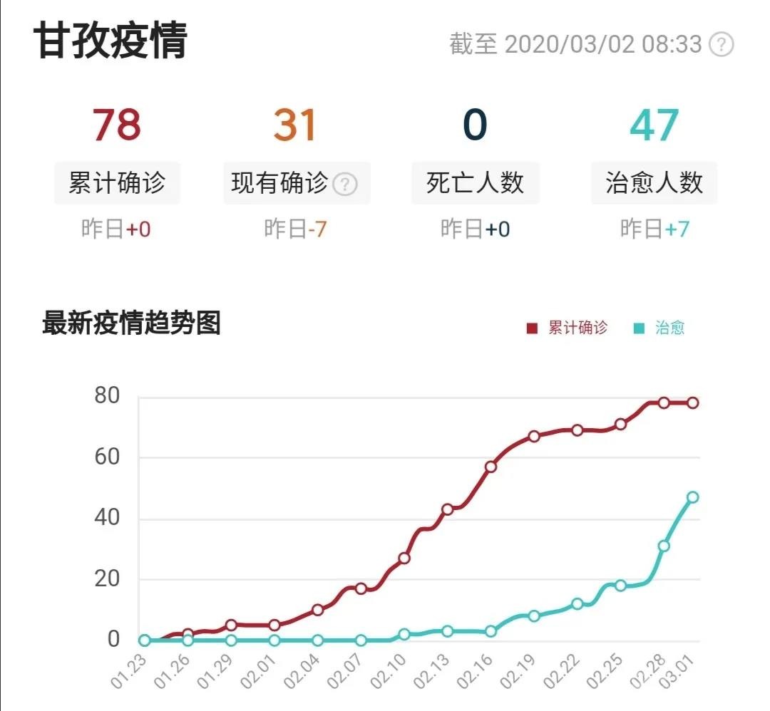 截至3月1日24時(shí),我州累計(jì)報(bào)告確診病例78例,累計(jì)治愈出院47人(道孚縣42人、康定市2人、色達(dá)縣2人、稻城縣1人),其余31人(重癥4例,危重癥1例)均在定點(diǎn)醫(yī)院隔離治療,203名密切接觸者正在接受醫(yī)學(xué)觀察。我州除道孚縣“五鄉(xiāng)一鎮(zhèn)”外,其余17個(gè)縣(市)連續(xù)27天無(wú)確診病例報(bào)告。