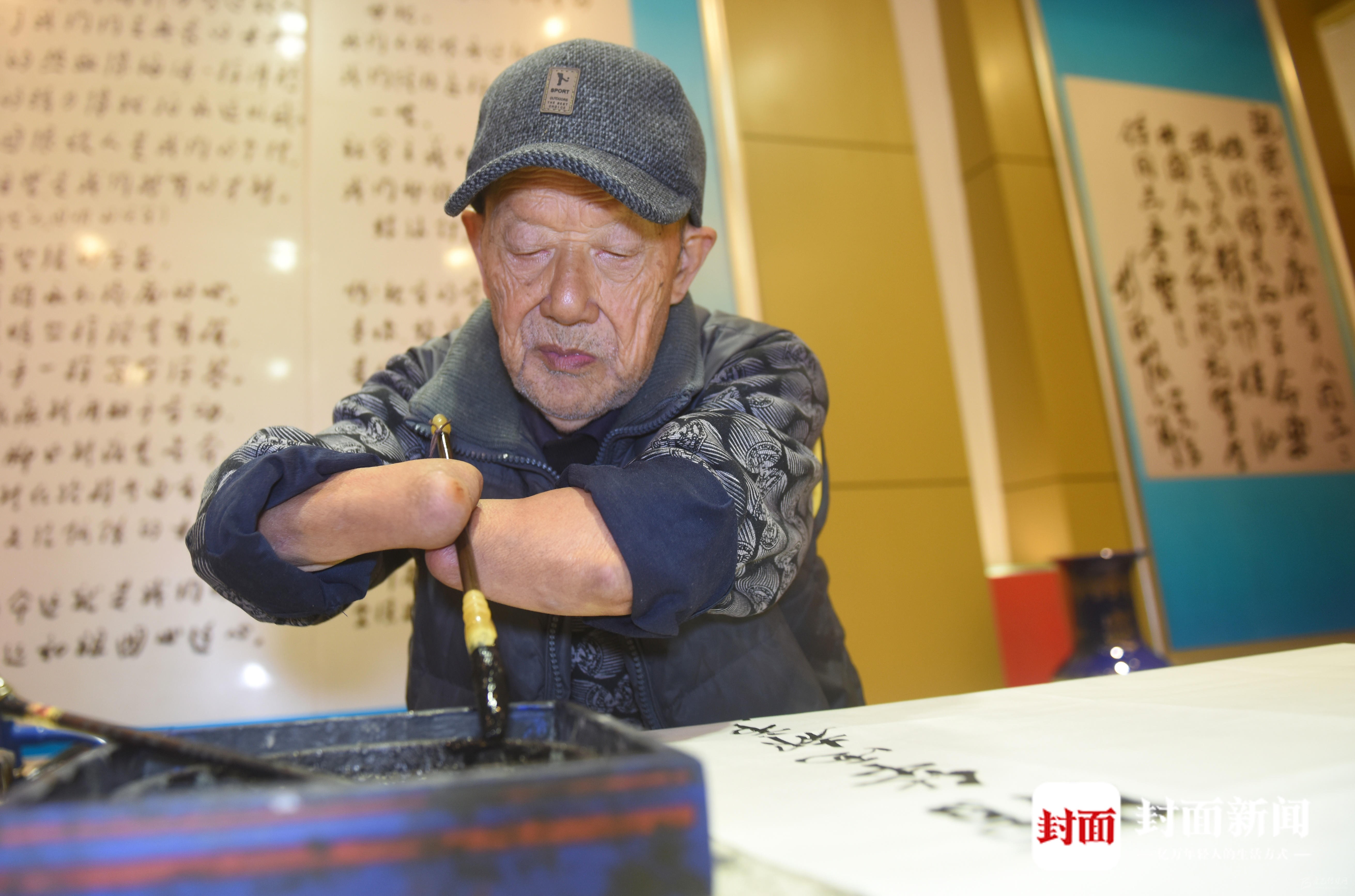 最初,他把鋼筆綁在手臂上,練習(xí)了一兩年才做到橫平豎直;之后,他用兩只斷臂抱著毛筆寫書法。