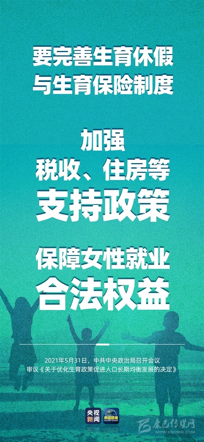 積極應(yīng)對(duì)人口老齡化,我國將出臺(tái)重大政策舉措。中共中央政治局5月31日召開會(huì)議,會(huì)議指出,進(jìn)一步優(yōu)化生育政策,實(shí)施一對(duì)夫妻可以生育三個(gè)子女政策及配套支持措施,有利于改善我國人口結(jié)構(gòu)、落實(shí)積極應(yīng)對(duì)人口老齡化國家戰(zhàn)略、保持我國人力資源稟賦優(yōu)勢(shì)。
