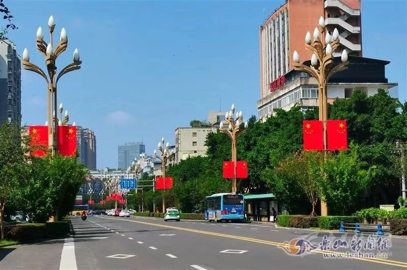 在樂山市,為營(yíng)造喜慶、熱烈、歡樂、祥和的節(jié)日氛圍,中心城區(qū)嘉定路、柏楊路等多條主干道,以及樂山岷江一橋和二橋共計(jì)1217柱燈桿上,懸掛了2000多面國(guó)旗,換上“紅裝”后的街道,在藍(lán)天的映襯下顯得格外美麗。