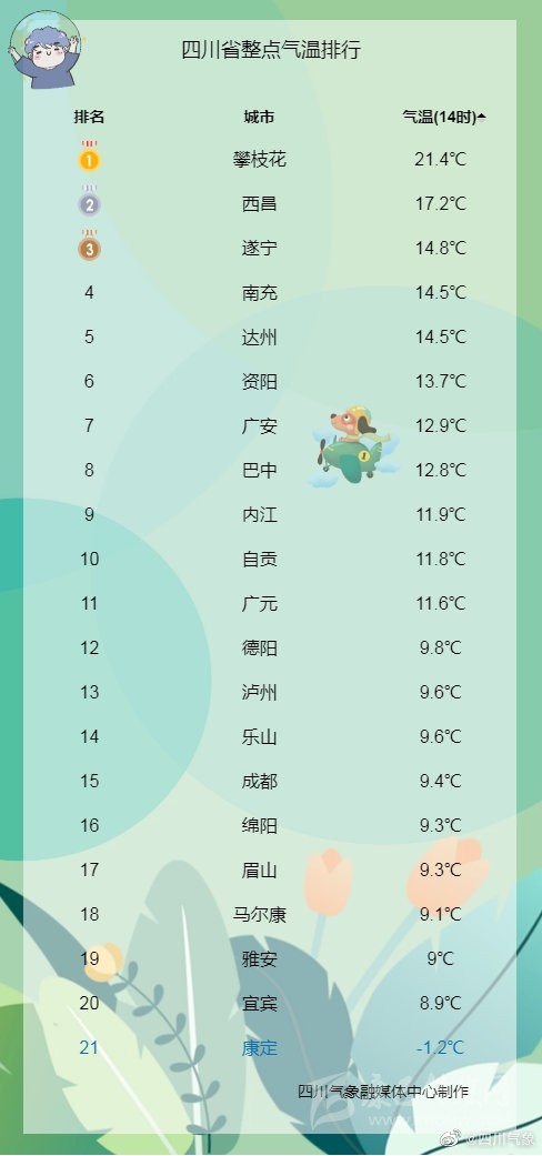 今天白天到晚上,盆地大部陰天間多云,其中巴中、南充、綿陽(yáng)、遂寧4市部分地方和西部沿山有零星小雨;甘孜州西北部、東南部,阿壩州南部及涼山州東北部多云間陰有分散陣雨雪(雨),川西高原和攀西地區(qū)其余地方多云間晴。24小時(shí)內(nèi),盆地最高氣溫11~14℃;最低氣溫:北部1~4℃,南部4~7℃。