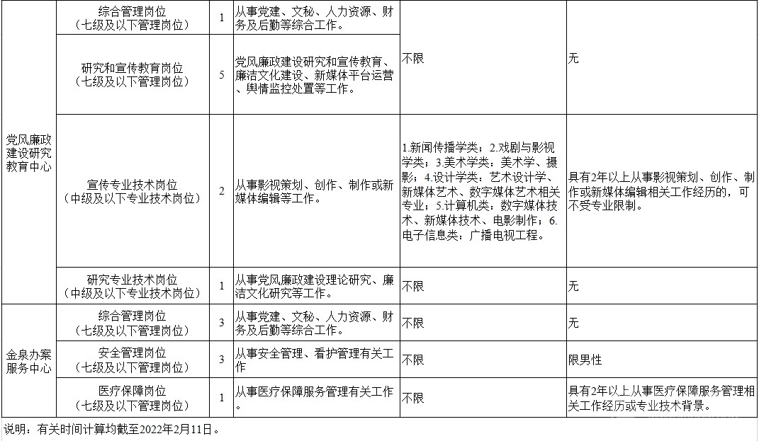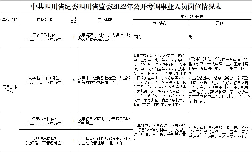 考調(diào)名額 考調(diào)事業(yè)人員25名。其中,信息技術(shù)中心管理崗位9名,黨風(fēng)廉政建設(shè)研究教育中心管理崗位6名、專業(yè)技術(shù)崗位3名,金泉辦案服務(wù)中心管理崗位7名。 考調(diào)對象及條件 考調(diào)對象 全省范圍內(nèi)行政單位或參公事業(yè)單位一級主任科員(含)以下職級及相當(dāng)職務(wù)層次人員;縣級及以上公益一類或全額撥款事業(yè)單位管理崗位七級及以下職員、專業(yè)技術(shù)崗位中級及以下工作人員。 考調(diào)條件 具有良好的政治素質(zhì)、專業(yè)素養(yǎng),品行端正,實(shí)績突出,群眾公認(rèn)。 中共黨員。 全日制大學(xué)本科及以上學(xué)歷,并取得相應(yīng)學(xué)士及以上學(xué)位。 年齡35周歲以下(1986年2月11日及以后出生)。 歷年年度考核均為合格(稱職)及以上。 身體心理健康,具有正常履行職責(zé)的身體條件和心理素質(zhì)。 符合報(bào)考崗位規(guī)定的資格條件,詳見《中共四川省紀(jì)委四川省監(jiān)委2022年公開考調(diào)事業(yè)人員崗位情況表》(附后)。 符合法律、法規(guī)規(guī)定的其他條件。 有關(guān)時(shí)間計(jì)算均截至2022年2月11日。 具有下列情形之一的,不得報(bào)考: 被依法列為失信聯(lián)合懲戒對象的。 涉嫌違紀(jì)違法正在接受有關(guān)專門機(jī)關(guān)審查尚未作出結(jié)論的。 受過黨紀(jì)政務(wù)處分或司法機(jī)關(guān)刑事處罰的。 受到誡勉、組織處理等影響期未滿或期滿影響使用的。 按照有關(guān)規(guī)定,到定向單位工作未滿服務(wù)年限或有其他限制性規(guī)定的。 尚在試用期的。 按照相關(guān)規(guī)定應(yīng)當(dāng)回避的。 法律、法規(guī)規(guī)定的其他情形。 報(bào)名及打印準(zhǔn)考證 2022年2月22日上午8:00至2月26日下午18:00,報(bào)名人員登錄四川省人力資源和社會保障廳官網(wǎng)(http://rst.sc.gov.cn/)首頁“人事考試”專欄進(jìn)行網(wǎng)上報(bào)名,每人限報(bào)一個(gè)崗位。 對報(bào)名人員進(jìn)行網(wǎng)上資格初審,通過資格初審者可于2022年3月1日上午8:00至3月2日下午18:00,登陸報(bào)名系統(tǒng)打印筆試準(zhǔn)考證。 考試 考試分筆試和面試。其中,信息技術(shù)崗位A、信息技術(shù)崗位B、宣傳專業(yè)技術(shù)崗位需加試專業(yè)測試。 根據(jù)筆試情況,擇優(yōu)確定進(jìn)入面試的人選,并適時(shí)開展資格復(fù)審和心理素質(zhì)測試。資格復(fù)審、心理素質(zhì)測試、面試時(shí)間和地點(diǎn)另行電話通知。 考察、體檢及試用 考察 根據(jù)考試情況,擇優(yōu)差額確定進(jìn)入考察對象,深入考察了解人選政治表現(xiàn)、工作能力、廉潔自律和性格特點(diǎn)等。 體檢 根據(jù)考察情況和職位要求,擇優(yōu)等額確定進(jìn)入體檢人選,參照《公務(wù)員錄用體檢通用標(biāo)準(zhǔn)(試行)》進(jìn)行體檢。 頂崗試用 綜合人選考試成績、考察情況,根據(jù)工作需要和人崗相適原則,擇優(yōu)確定頂崗試用人選。 調(diào)入 試用期滿后,根據(jù)考調(diào)名額和試用期間表現(xiàn),研究確定擬調(diào)人員,經(jīng)公示后按規(guī)定程序辦理調(diào)入手續(xù)。 注意事項(xiàng) 報(bào)考者應(yīng)保證提供真實(shí)、準(zhǔn)確、全面的個(gè)人信息和資料,如有弄虛作假的行為,將按有關(guān)規(guī)定嚴(yán)肅處理。 資格審查貫穿考調(diào)全過程,任一環(huán)節(jié)發(fā)現(xiàn)有不符合考調(diào)條件的,取消考調(diào)資格。 報(bào)名時(shí)請按要求填寫本人手機(jī)號碼,并保持通訊暢通。未入圍下一環(huán)節(jié)人員,不再另行通知。 進(jìn)入資格復(fù)審者,需由有干部管理權(quán)限的主管部門出具同意考調(diào)的書面意見并加蓋公章。 嚴(yán)明考調(diào)紀(jì)律,報(bào)名者不得托人說情、打招呼,一經(jīng)發(fā)現(xiàn)即取消資格。 遵守疫情防控相關(guān)規(guī)定,服從工作人員安排。 同時(shí),四川省紀(jì)委監(jiān)委還提供相關(guān)咨詢電話:028—62555435;62555354。 (點(diǎn)擊查看大圖)