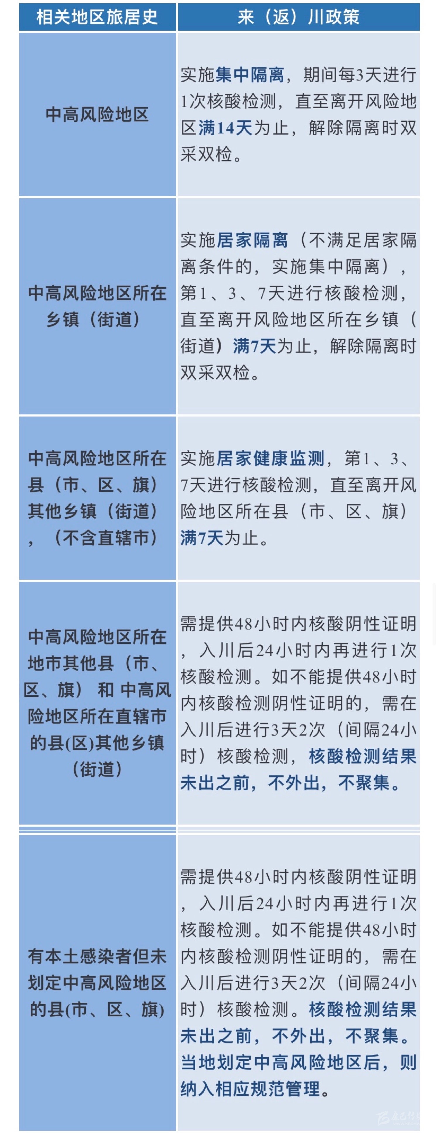 全省中小學(xué)校、托幼機(jī)構(gòu)師生員工本人或其共同居住的家人14天內(nèi)有省外旅居史、有與省外返川人員密切接觸史的,返校時(shí)應(yīng)提供48小時(shí)內(nèi)核酸檢測(cè)陰性證明;如不能提供48小時(shí)內(nèi)核酸檢測(cè)陰性證明的,需在返校后24小時(shí)內(nèi)進(jìn)行1次核酸檢測(cè)。
